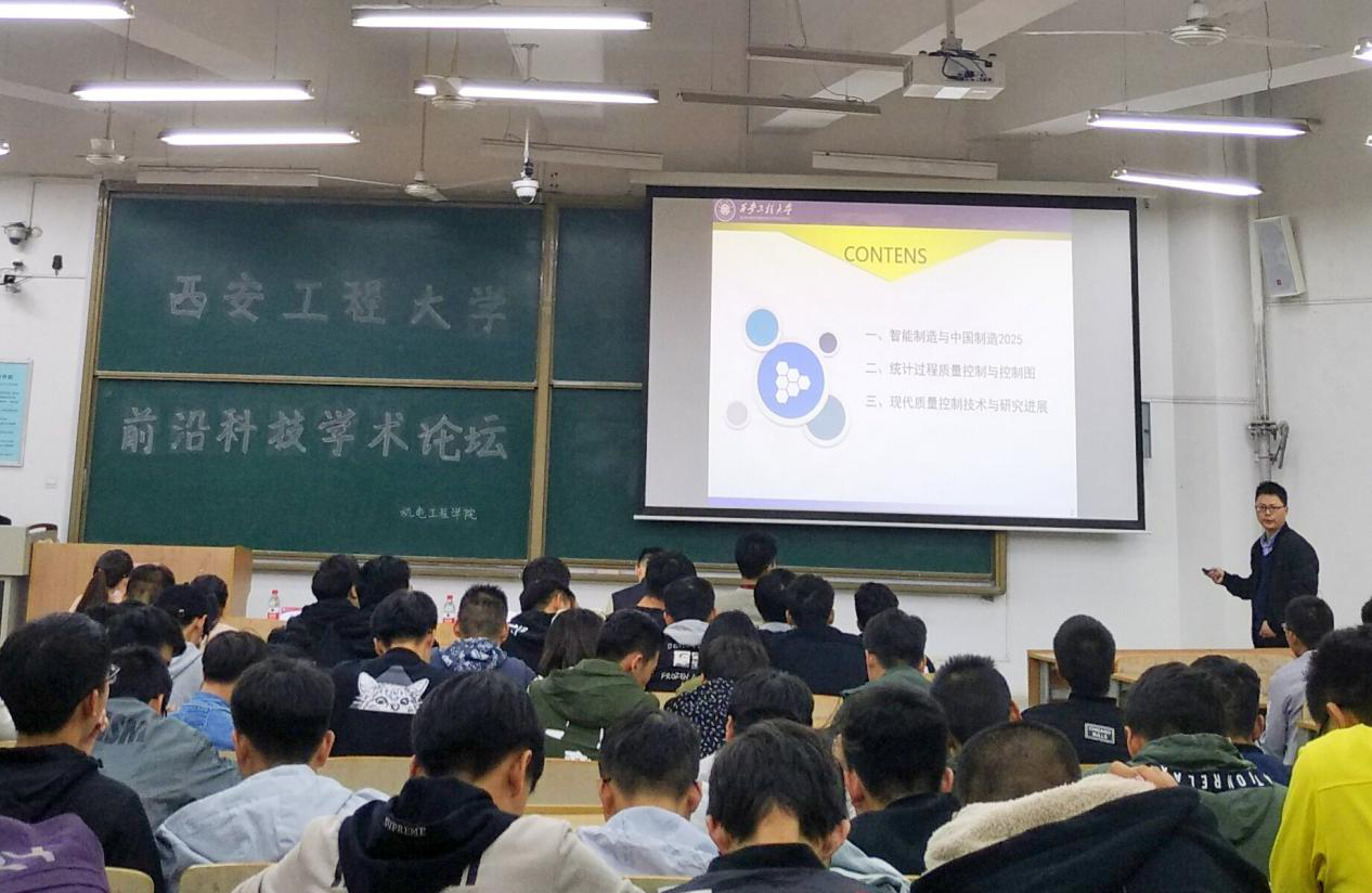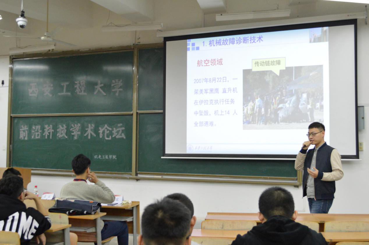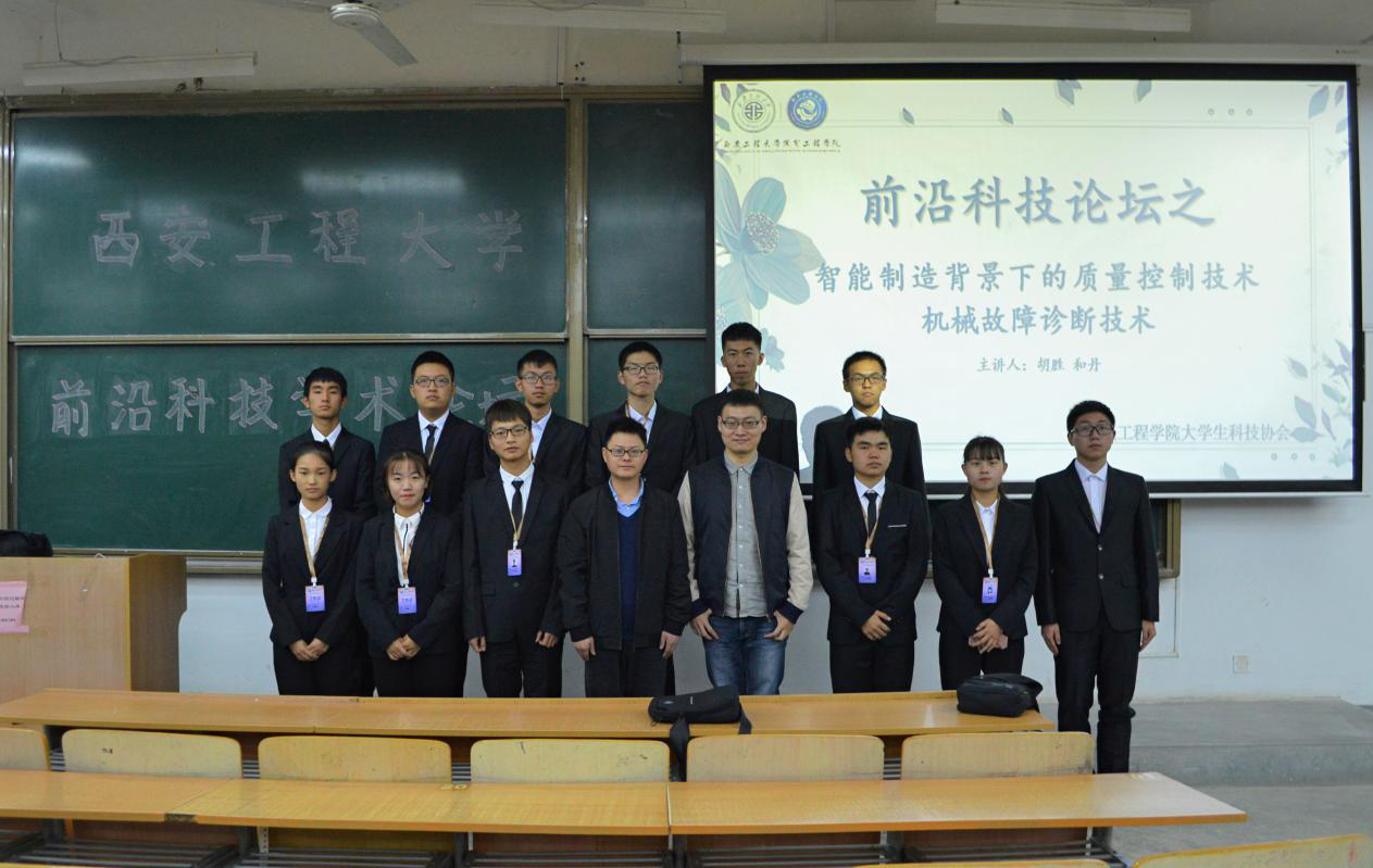 本次前沿科技学术论坛分为两个部分,第一部分由和丹讲解机械故障诊断技术,第二部分由胡胜对智能制造背景下的质量控制技术进行讲解。两位青年教师从专业度对“中国制造2025”与自身的研究进行了介绍讲解,使学生更为具体地了解到机械故障诊断及处置的相关知识。