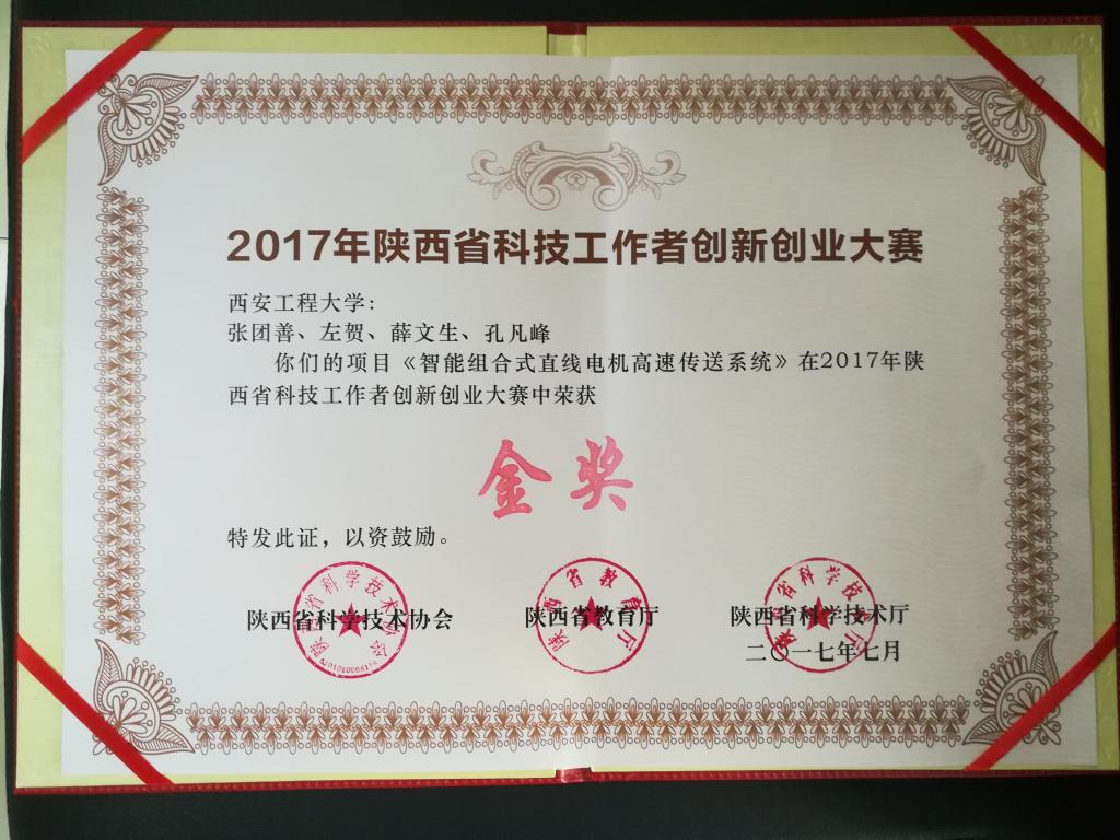 7月8日至9日,2017年陕西省科技工作者创新创业大赛决赛在西安隆重举行,由机电学院教师张团善带领团队研发的项目《智能组合式直线电机高速传送系统》荣获大赛金奖。