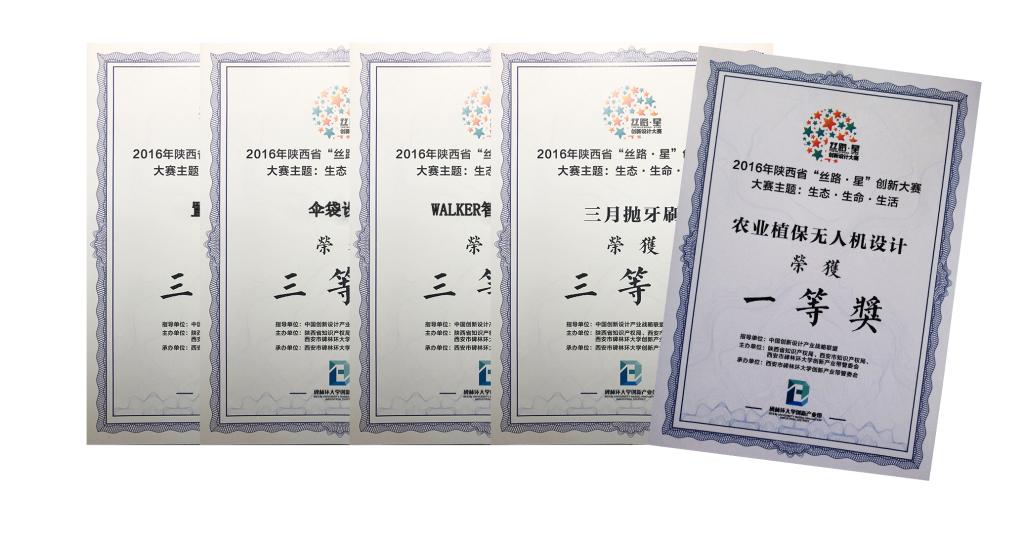 陕西省“丝路•星”创新设计大赛涉及工业产品、绿色生活、建筑科技、3D打印定向设计、文创类定向设计等方向。大赛以“生态·生命·生活”为主题,共征集到参赛作品3592件,其中,我校提交了100余件作品。由机电学院工业设计系副教授孙薇指导,2016级研究生杨筱颀为代表的团队作品《农业植保无人机设计》荣获大赛一等奖;由孙薇指导,2016级研究生崔思佳为代表的团队作品《三月抛牙刷》荣获三等奖;由工业设计系教授张阿维指导,2016级研究生张婷婷为代表的团队作品《伞袋设计》荣获三等奖;由张阿维指导,2015级研究生王钰为代表的团队作品《WALKER智能平衡车》荣获三等奖;由张阿维指导,2014级研究生匡琪为代表的团队作品《置物架》荣获三等奖,我校荣获优秀组织奖。
