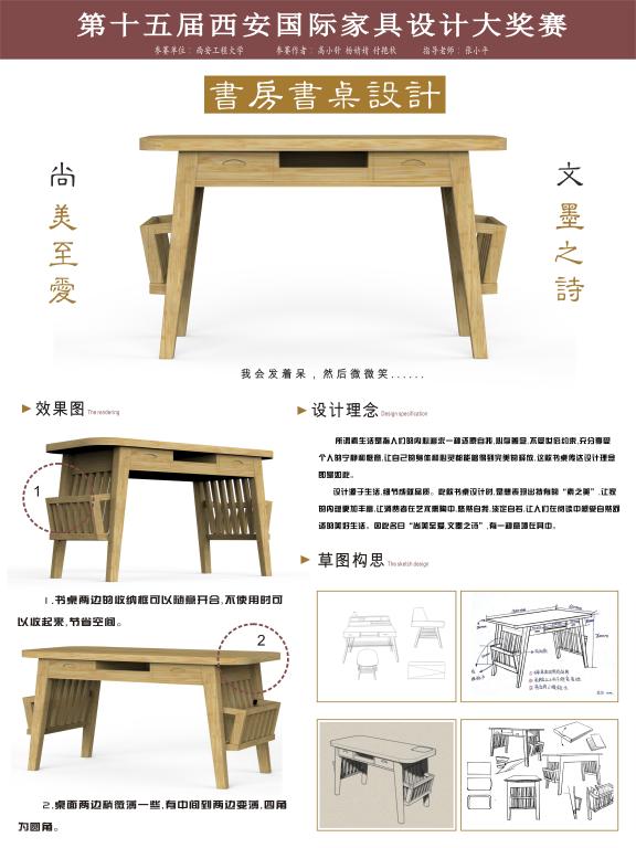 本次大赛有来自太阳集团城官网、西安交通大学、西北大学、西北工业大学等20所院校的设计、环艺、艺术系师生和西安来福家具研究所及广大设计师和家具爱好者参加,由我校机电学院教师张小平指导的高小针、杨婧婧、付艳秋等3位同学的作品《尚文书桌》荣获新式书桌设计金奖,米伟明等38位同学荣获优秀奖,教师张小平荣获优秀指导教师奖,同时,我校也是参赛院校中获奖最多的学校。