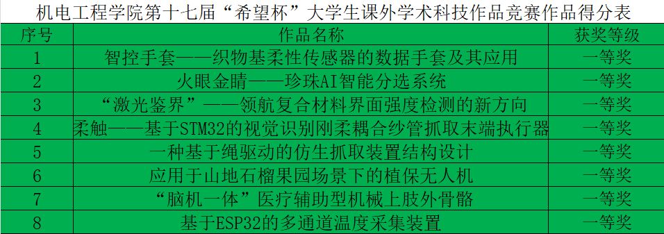 经过专家组的严谨评审与综合评议,最终评选出各类奖项:朱家沛同学的《智控手套 — 织物基柔性传感器的数据手套及其应用》等8件作品荣获一等奖;杨飞洋同学的《花椒采摘机》等 12 件作品斩获二等奖;张锦绣同学的《采摘小车》等 16 件作品获得三等奖。此次获奖作品涵盖智能装备、自动化控制、机械创新设计等多个领域,既紧密结合专业知识,又聚焦行业需求与社会热点,充分体现了suncitygroup太阳新城在人才培养中对 “学用结合、创新实践” 的重视。